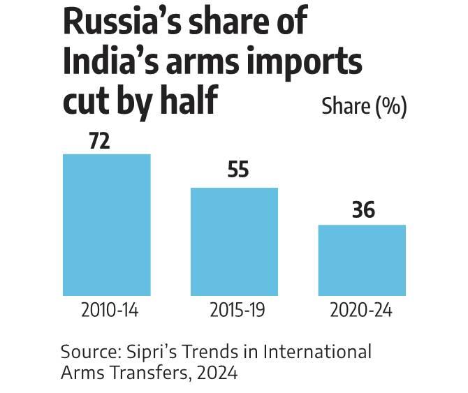 According to a Stockholm International Peace Research Institute report released in March, Russia accounted for 36 per cent of India's major arms imports during 2020-24, still the largest share but down from 55 per cent in 2015-19 and 72 per cent in 2010-14.