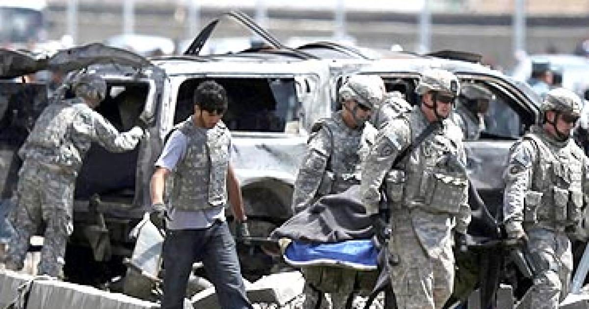 Image: US soldiers carry a body at the site of a suicide car bomb in Kabul on Tuesday