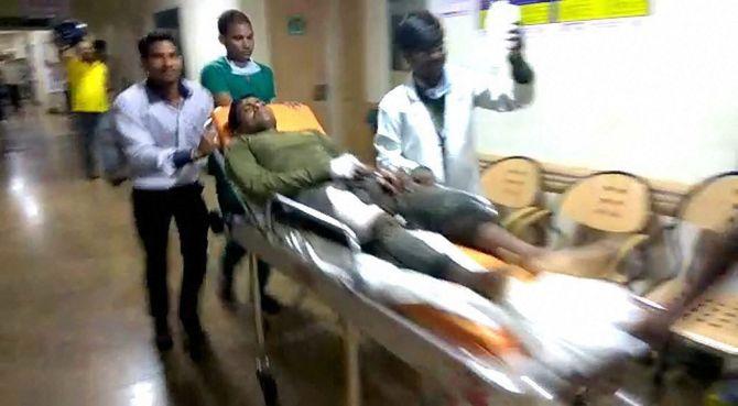 IMAGE: A jawan is being taken to a hospital after Maoist attack in Sukma, Chhattisgarh on Saturday. Photograph: PTI Photo