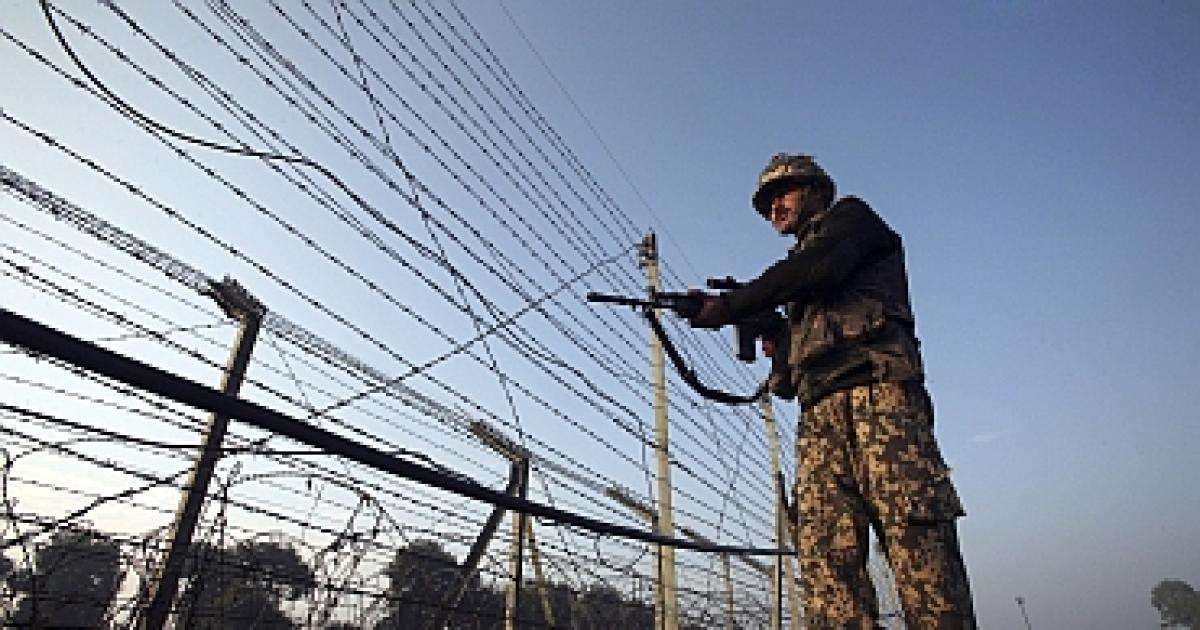 Image: An Border Security Force soldier patrols near the fenced border with Pakistan in Suchetgarh, southwest of Jammu | Photograph: Mukesh Gupta/Reuters