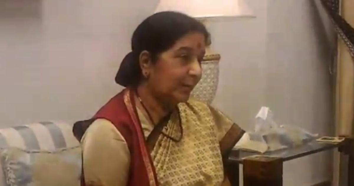 Image: External Affairs Minister Sushma Swaraj speaks with the press in Pakistan after her arrival for the two-day visit. Photograph: Vikash Swarup/ Twitter