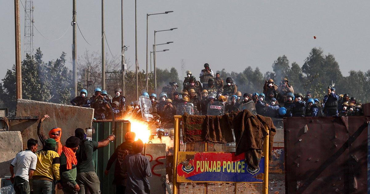 IMAGE: Farmers confront the police at Shambhu, a border crossing between Punjab and Haryana, February 14, 2024, as they march towards New Delhi to press for better crop prices promised to them in 2021. Photograph: Anushree Fadnavis/Reuters
