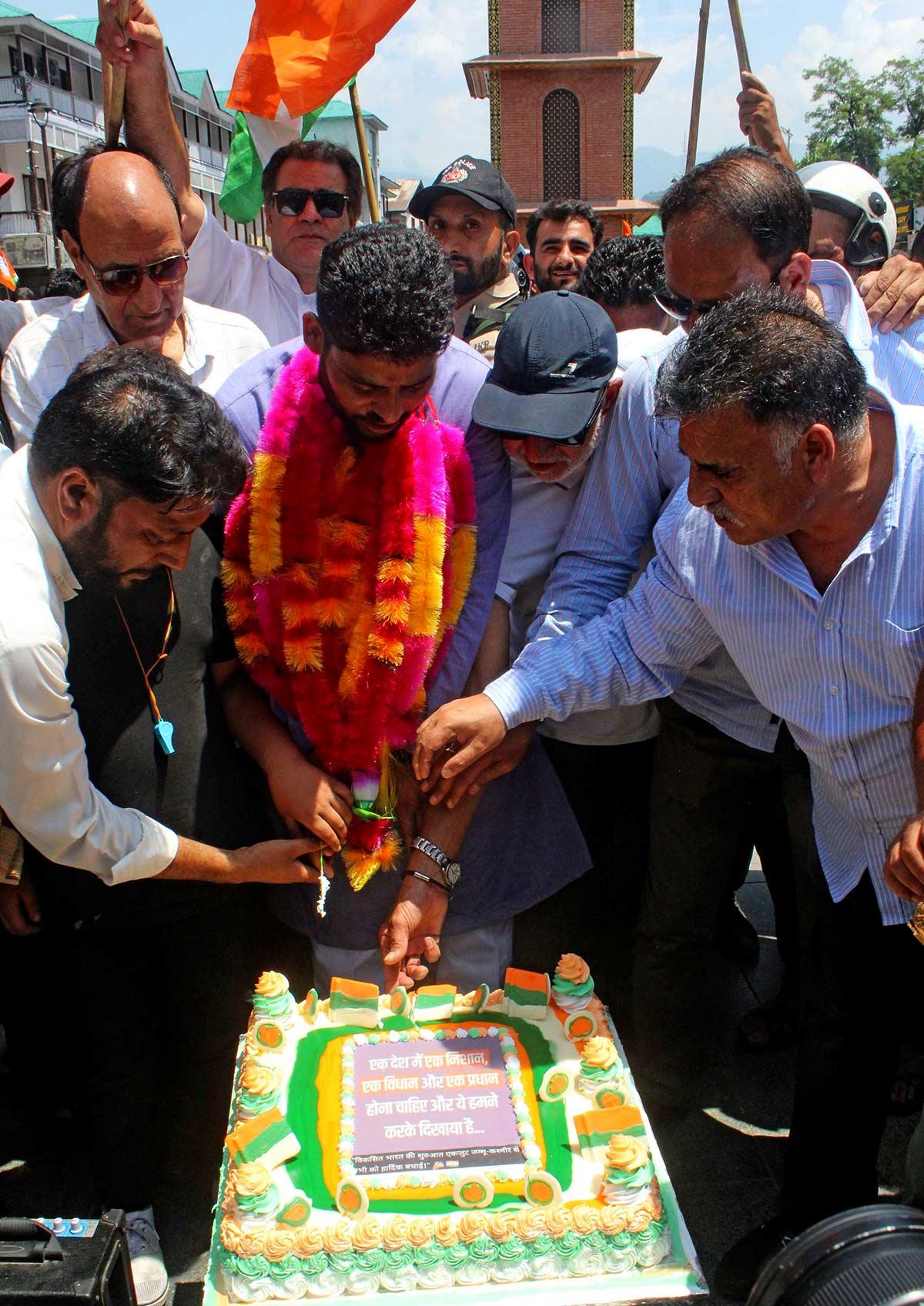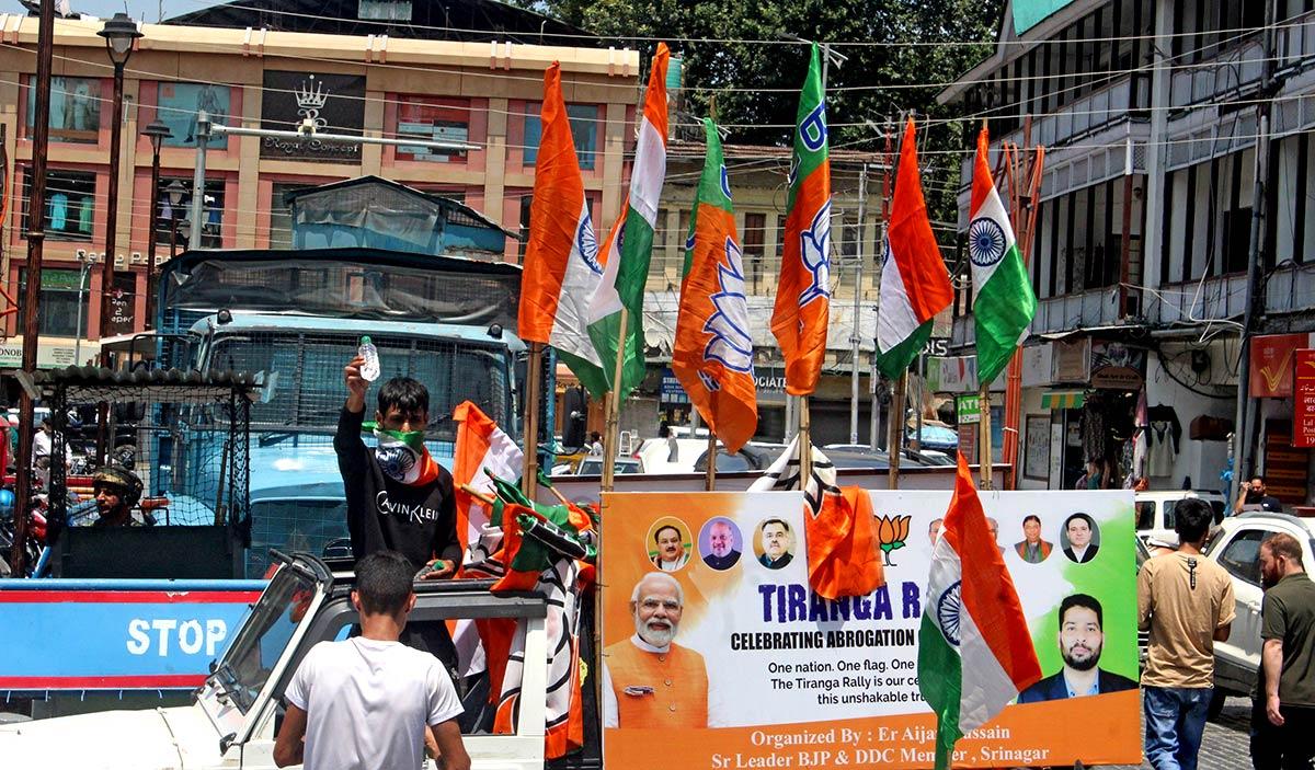 Bharatiya Janata Party leaders and workers during the Tiranga rally at historic Ghanta Ghar in Srinagar.