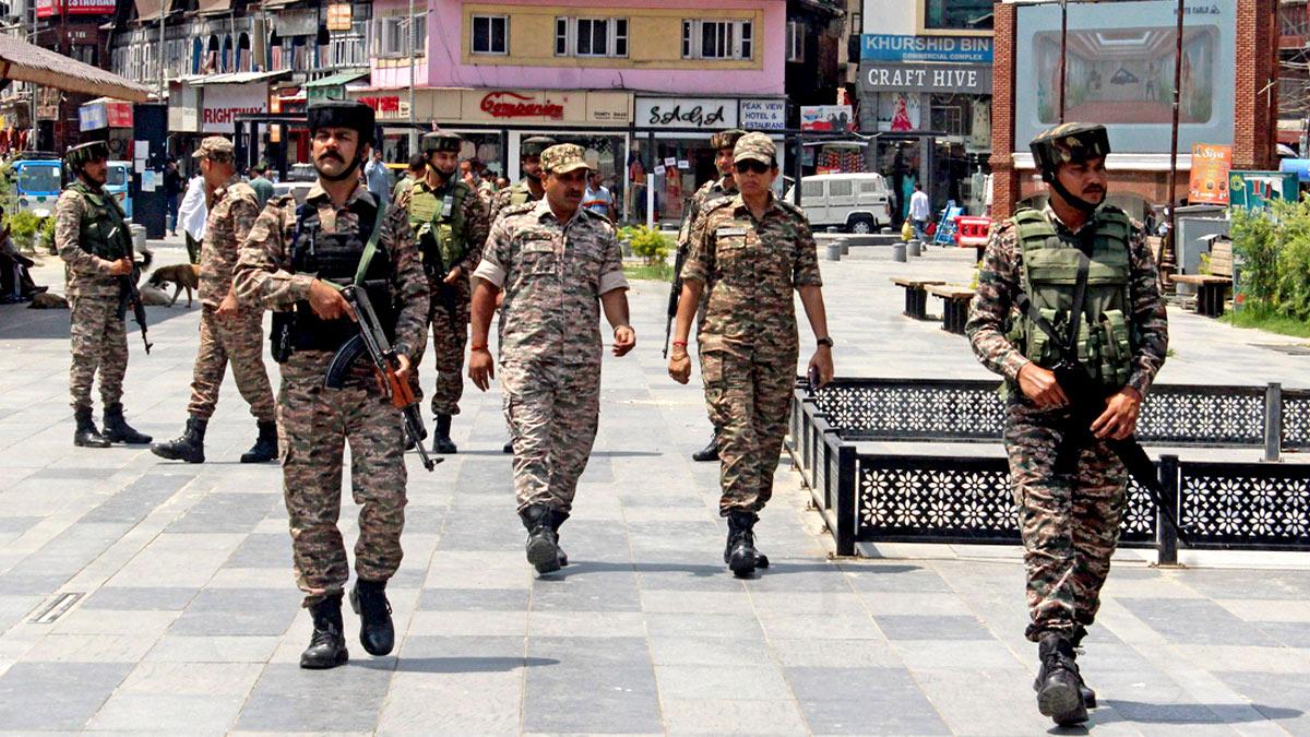Security personnel keep a vigil in Srinagar on the occasion of the 6th anniversary.