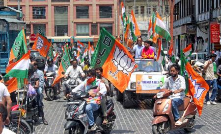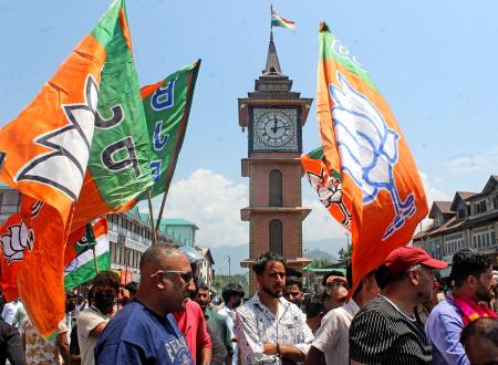 Bharatiya Janata Party leaders and workers during the Tiranga rally at historic Ghanta Ghar in Srinagar.