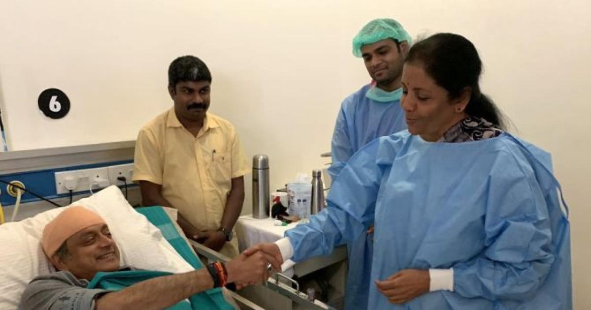 Defence Minister Nirmala Sitharaman on Tuesday called on Congress leader Shashi Tharoor, who is in hospital after suffering head injuries while performing a ritual at a temple in Thiruvananthapuram.