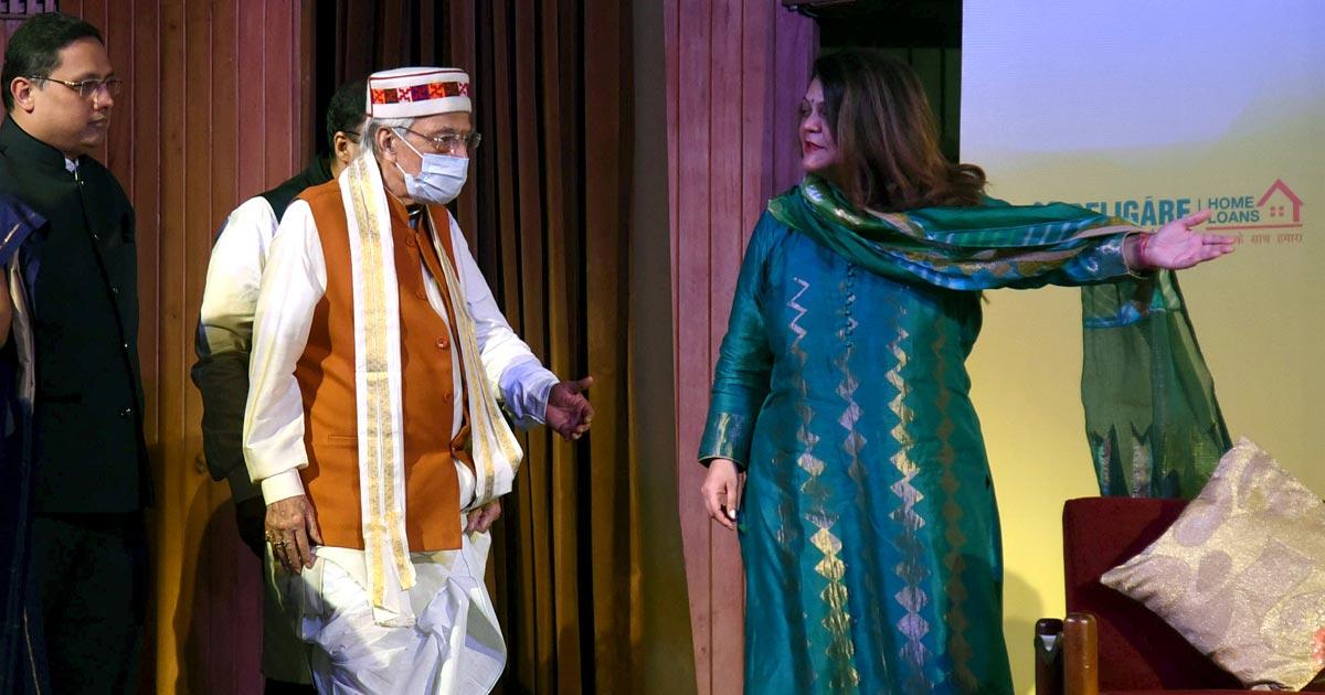 IMAGE: Dr Joshi felicitates Tokyo Paralympic 2020 Silver Medalist Suhas Lalinakere Yathiraj, who is also an IAS officer of the 2007 batch and currently serves as the district magistrate for Gautam Buddh Nagar.