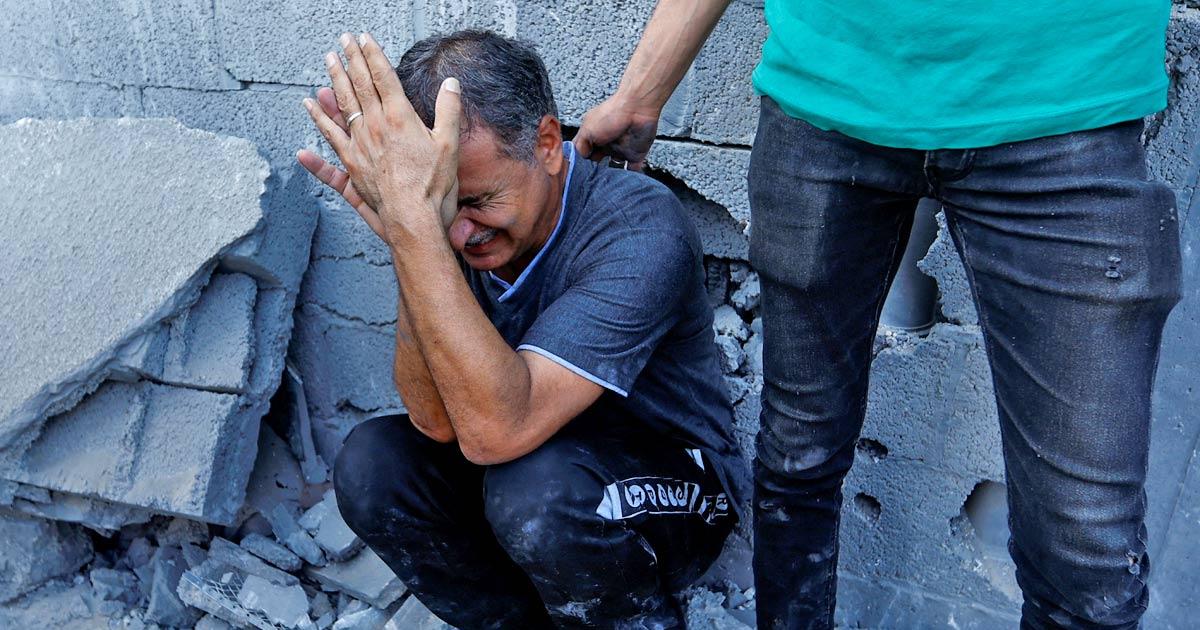 IMAGE: A Palestinian weeps as others search for casualties following an Israeli strike on a house in Khan Younis in the southern Gaza Strip. Photograph: Ibraheem Abu Mustafa/Reuters