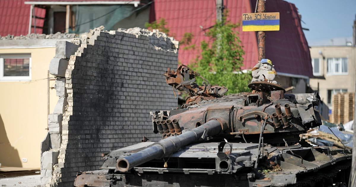 IMAGE: A children's cuddly toy sits on top of a destroyed Russian main battle tank, next to war damaged homes in Hostomel. Photograph: Christopher Furlong/Getty Images