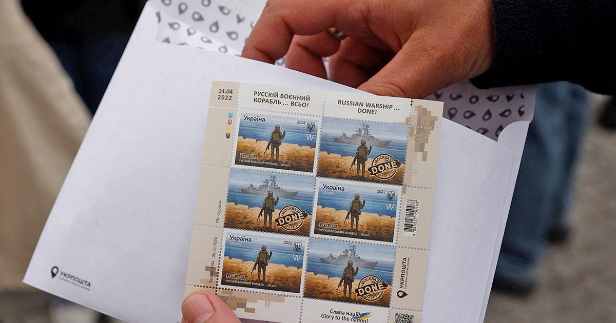 IMAGE: A man shows a series of commemorative Snake Island anti-Russian stamps that he bought in Kyiv. One of the stamps with the soldier and the warship reads 'Russian Warship Done!'