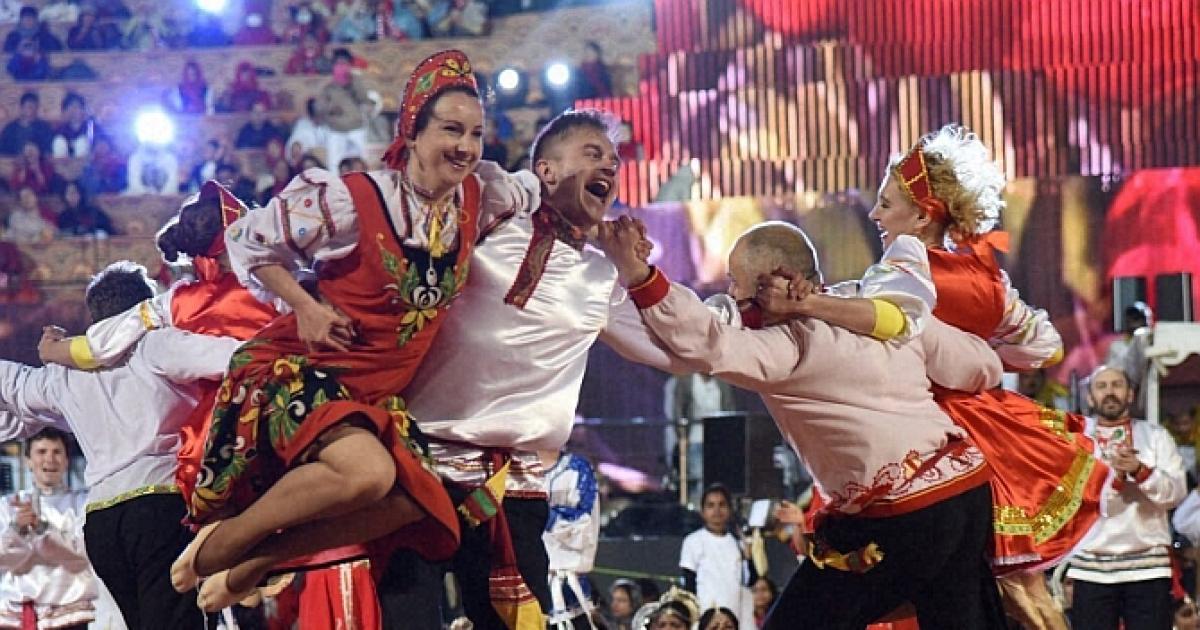 Image: Russian artists perform during the World Culture Festival on the banks of Yamuna River. Photograph: PTI Photo