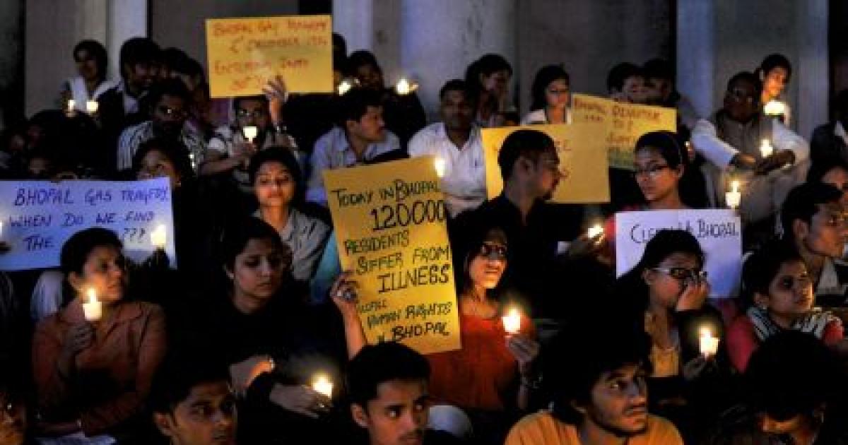 Image: Activists from Bengaluru Solidarity Group, a social group, hold candles and placards during a vigil to commemorate the 30th anniversary of Bhopal gas tragedy. Photograph: Reuters