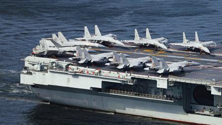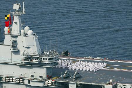 IMAGE: The Shandong, China's first domestically built aircraft carrier, with its roster of fighter aircraft. Photograph: Lam Yik/Reuters