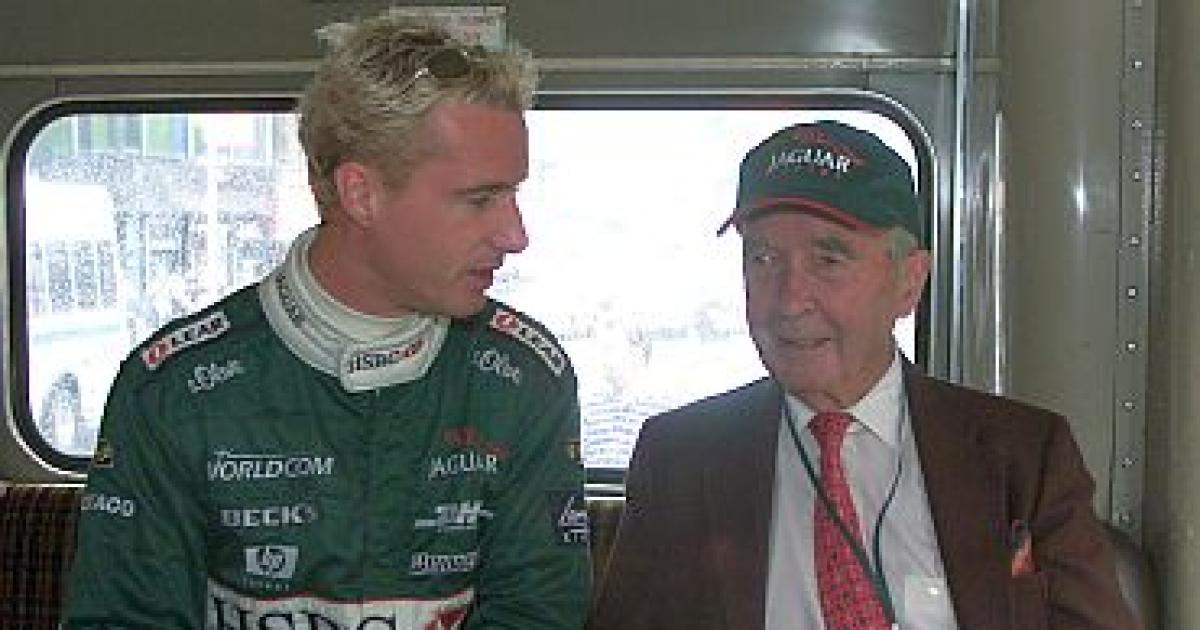 Image: File photo shows British author Dick Francis with Driver Eddie Irvine of the British Jaguar Formula One team.