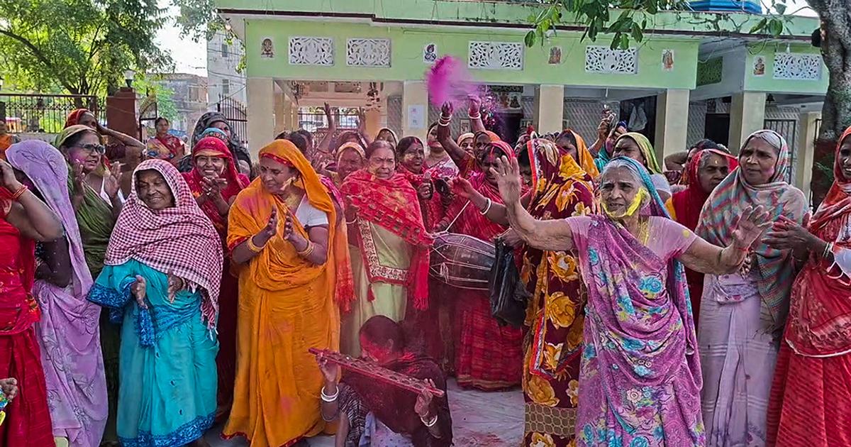 IMAGE: Women in Chief Minister Nitish Kumar's village, Kalyan Bigha, celebrate NDA's lead in the vote counting of the Bihar assembly election 2025, in Nalanda, November 14, 2025. Photograph: ANI Video Grab