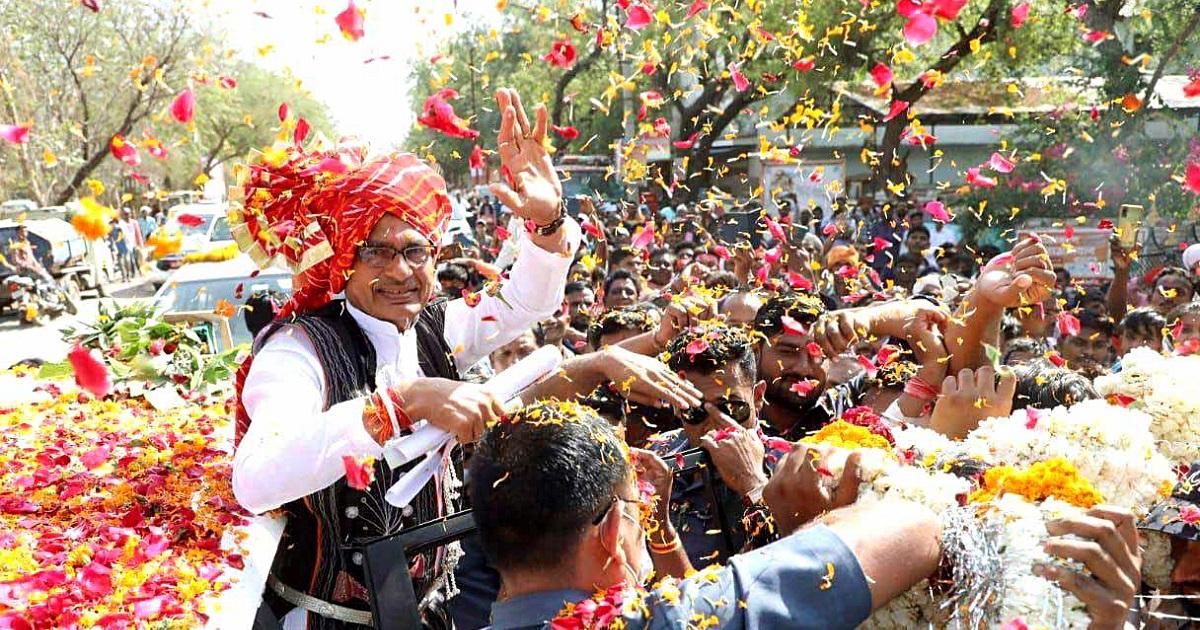 IMAGE: Madhya Pradesh Chief Minister Shivraj Singh Chouhan waves to the people during Bhagoria festival, at Thandla, in Jhabua, March 15, 2022. Photograph: ANI Photo