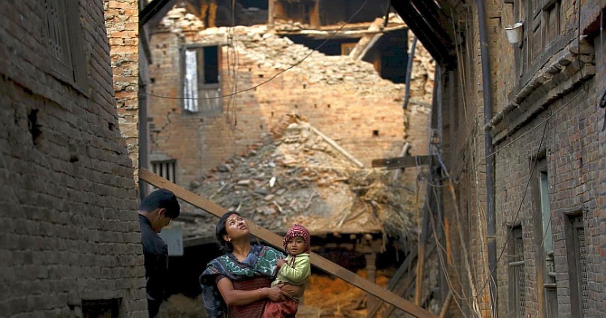 Image: A woman carrying her child stands in an alley surrounded by damaged and collapsed houses following April 25 earthquake at Bhaktapur. Photograph: Navesh Chitrakar/Reuters