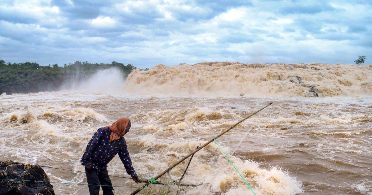 IMAGE: A fisherman casts a fishing net in the swollen Narmada river following heavy rains, at Bhedaghat in Jabalpur. Photographs: PTI Photo