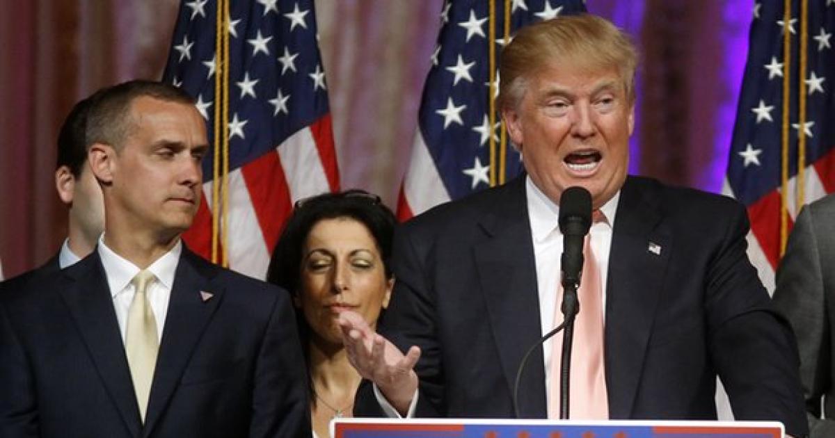IMAGE: Corey Lewandowski, standing left of Donald Trump, was fired from his post as campaign manager. Photograph: Twitter