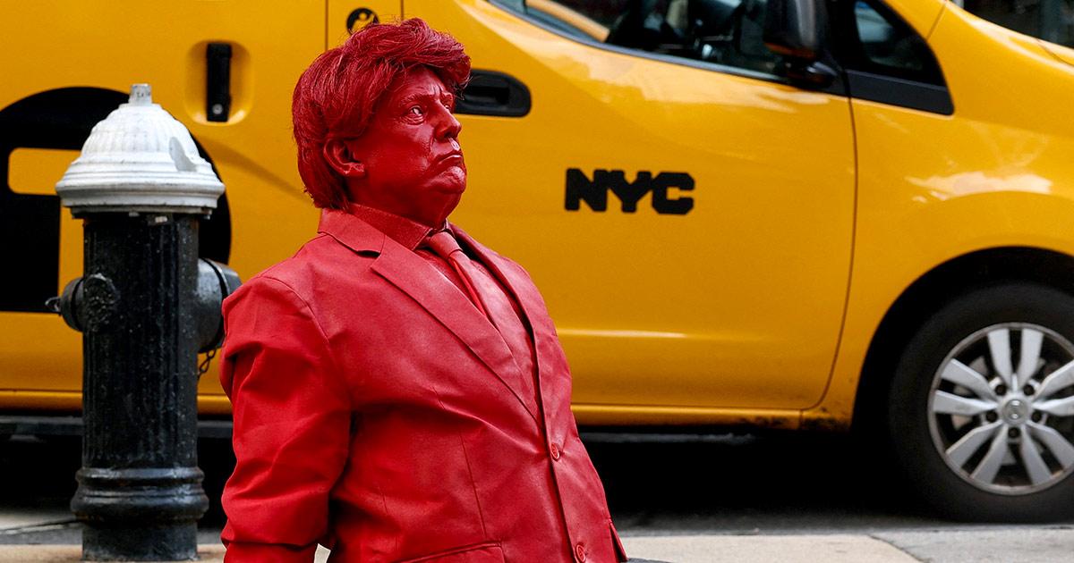 IMAGE: A sculpture of US President Donald John Trump emerging from a manhole, created by artist James Colomina, is displayed in Manhattan. Photograph: Kylie Cooper/Reuters