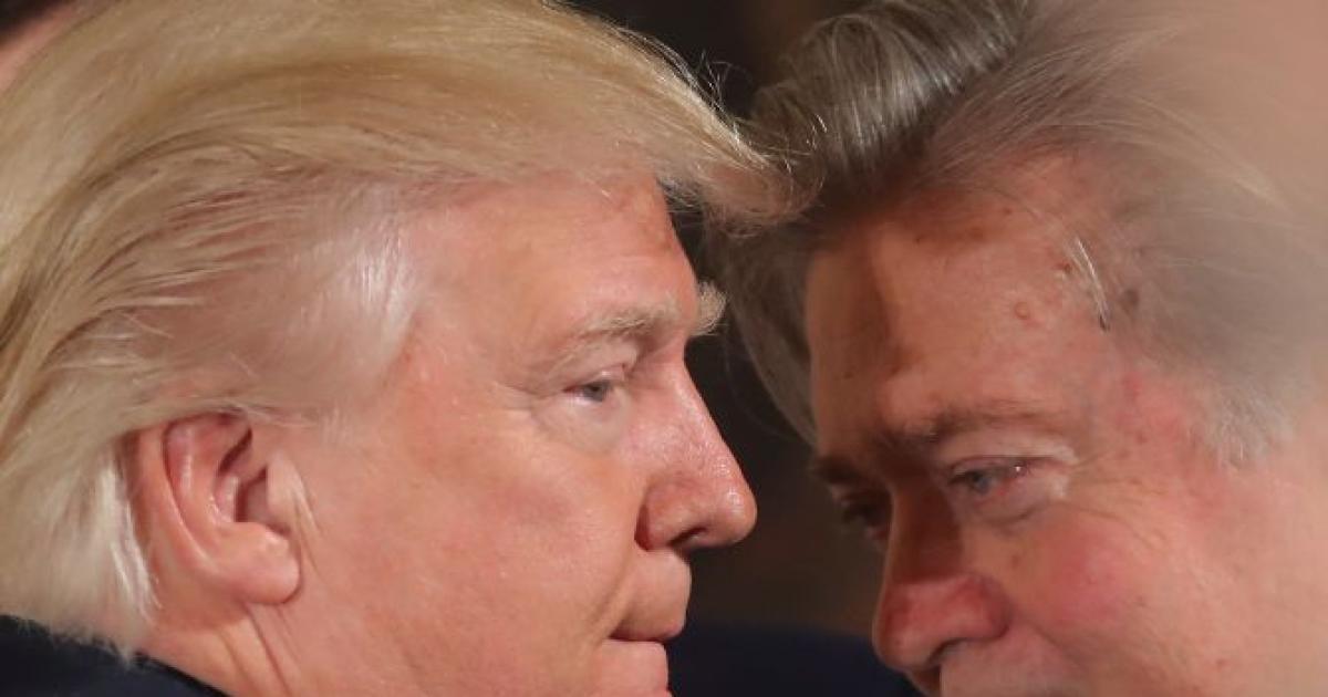 IMAGE: A file photo of President Donald Trump talking to senior staff Steve Bannon at the White House. Photograph: Carlos Barria/Reuters