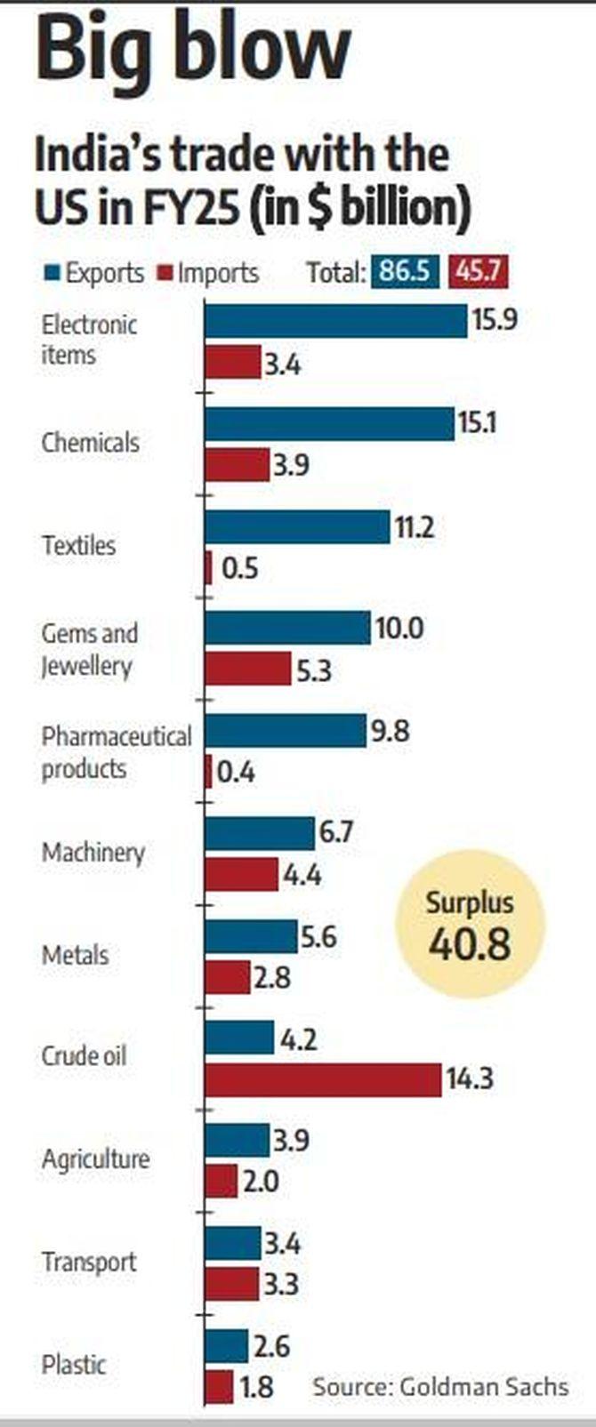 Ajay Srivastava, founder of think-tank Global Trade Research Initiative and a former trade official, says a 50 per cent tariff exempts 28 per cent of India's $86 billion in goods exports to the US, its biggest market, but "the remaining 72 per cent will take a major hit".