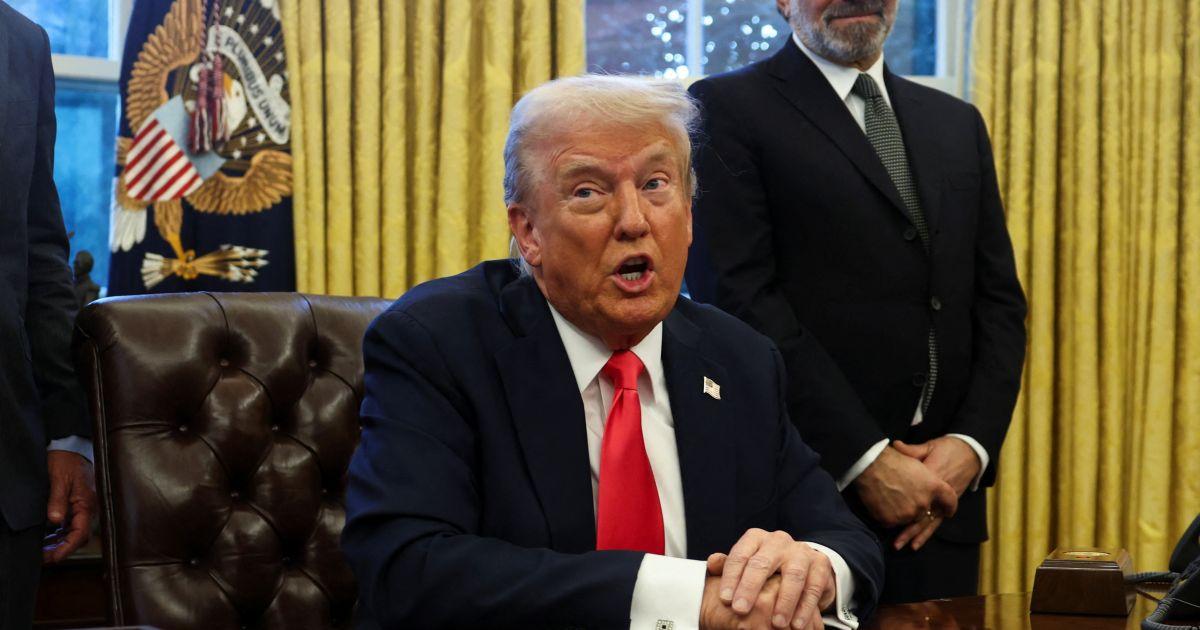 IMAGE: US President Donald Trump speaks as he signs an executive order in the Oval Office, at the White House in Washington, DC, on February 25, 2025. Photograph: Evelyn Hockstein/Reuters