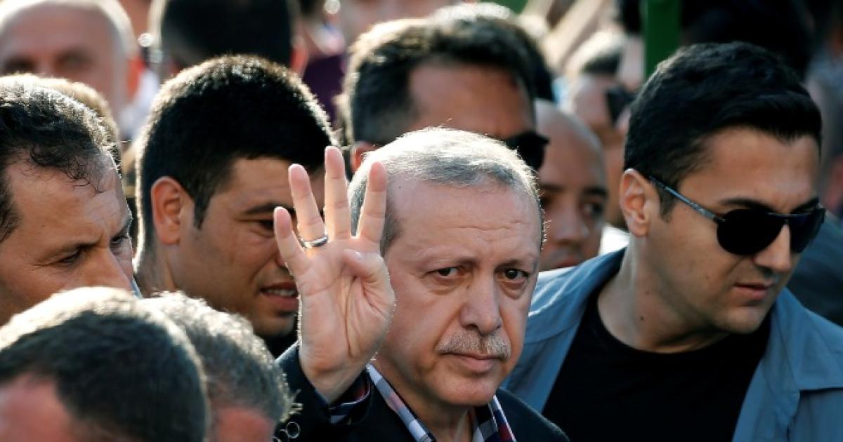 IMAGE: Turkish President Recep Tayyip Erdogan waves to the crowd following a funeral service for a victim of the thwarted coup in Istanbul, Turkey, July 17, 2016. Photograph: Alkis Konstantinidis/Reuters