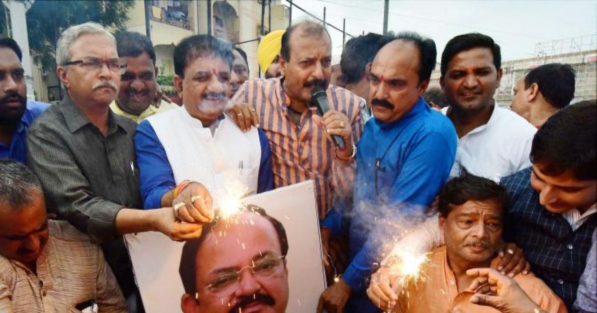 IMAGE: Supporters of Vice President-elect Venkaiah Naidu in Bhopal celebrate his victory on Saturday. Photograph: PTI Photo