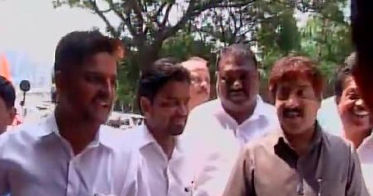 Image: The six Shiv Sena members who blackened Kulkarni's face on their way to meet Sena chief Uddhav Thackeray. Photograph: ANI/ Twitter
