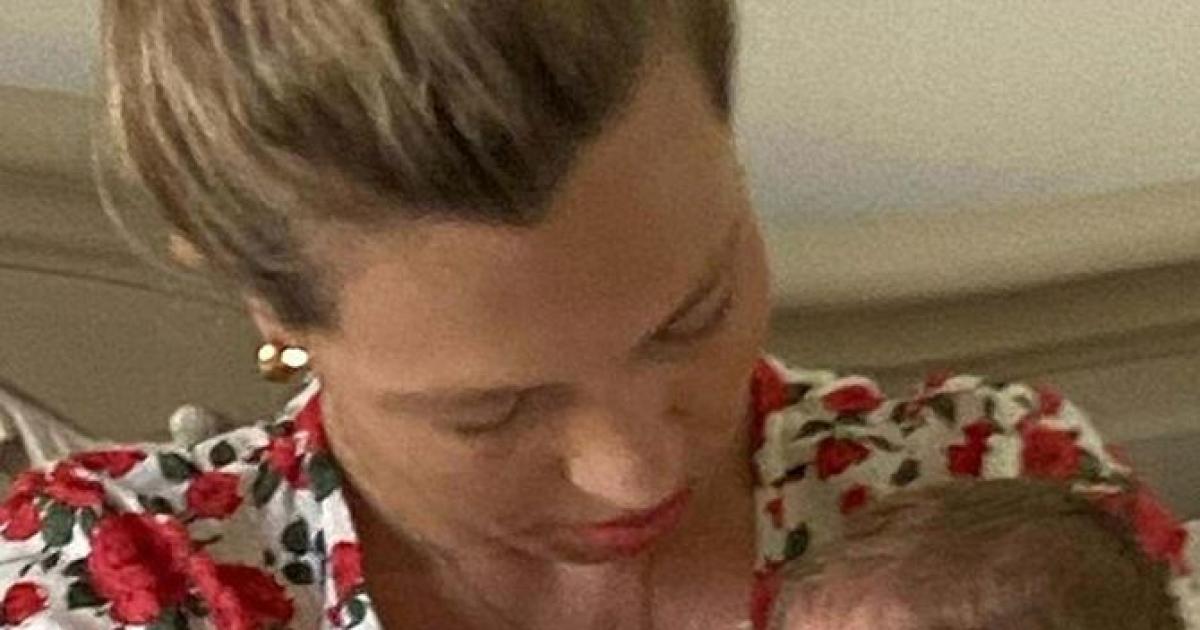The picture alongside the post shows Symonds cradling the new-born, who can be seen with a full head of hair and wrapped in a cream blanket.