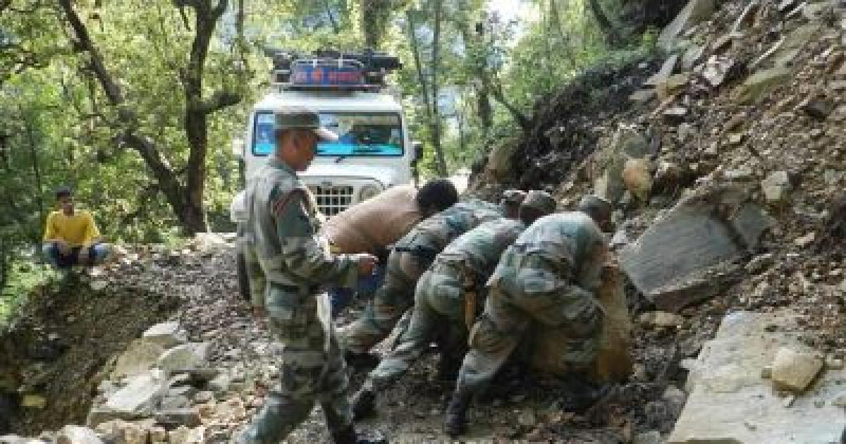 Image: Army personnel clear a landslide-blocked road in flood-ravaged Uttarakhand