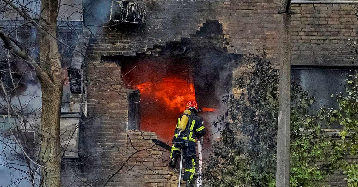 IMAGE: Firefighters work to put out a fire in a residential building in Kyiv hit by a Russian missile. Photograph: Oleksandr Gusev/Reuters