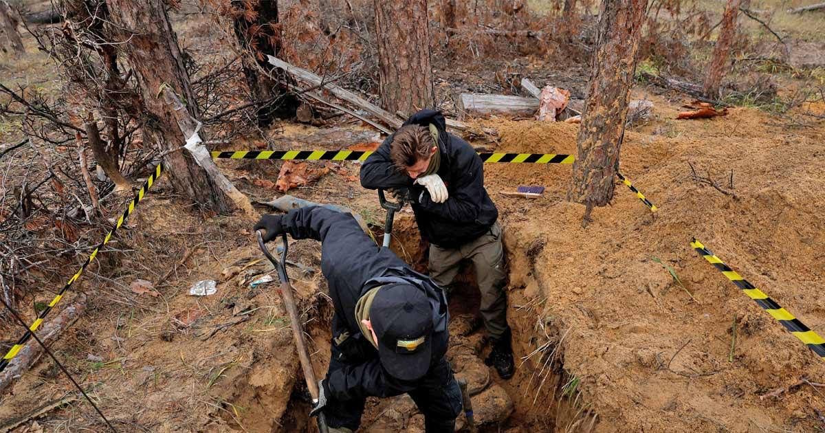 IMAGE: Andrii Smeiko 21, and Artur Simeiko 26, who are with the humanitarian mission 'Black Tulip', exhume the body of a fallen Ukrainian soldier in Yampil, Ukraine.