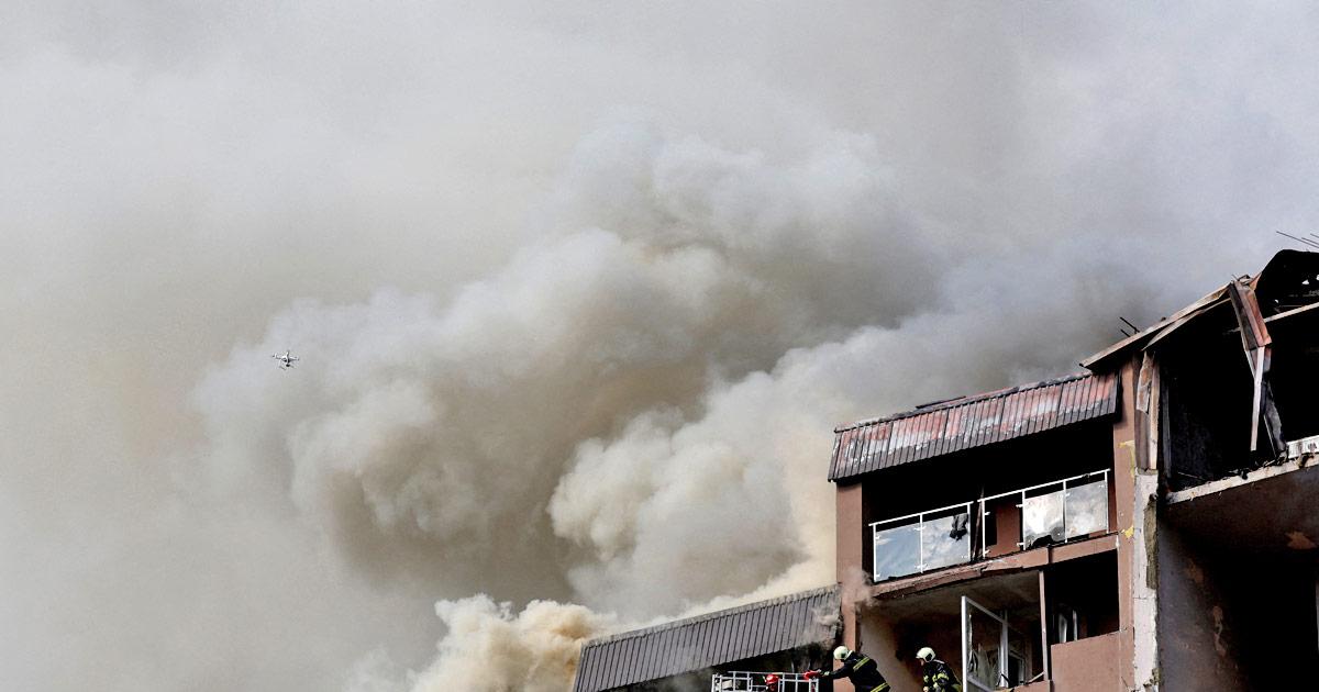 IMAGE: Firefighters work to put out a fire as smoke rises from a residential building damaged by a Russian missile strike in Kyiv. Photograph: Valentyn Ogirenko/Reuters