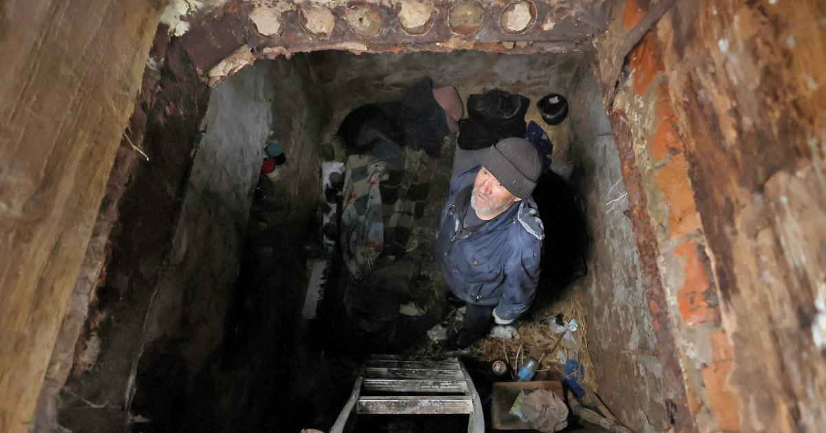 IMAGE: Myhaylo Yurkiv, 65, stands in the small bunker he stayed in for six months during fierce battles under Russian occupation which destroyed every home in the village in Tsupivka and cut the village in two by the shelling of a bridge, leaving him now as the only person living on his side of the village. Photograph: Clodagh Kilcoyne/Reuters