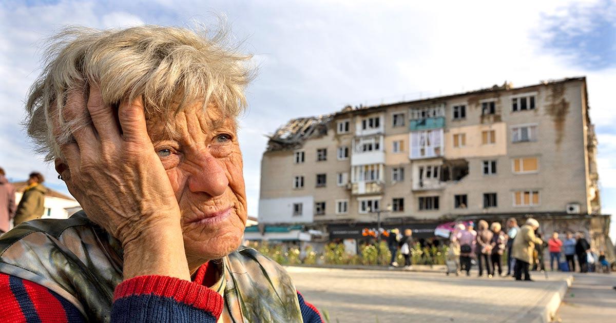 IMAGE: Galina Ivanenko, 77, sits in the central square in Izium. She never left the city because she was taking care of handicapped family members.