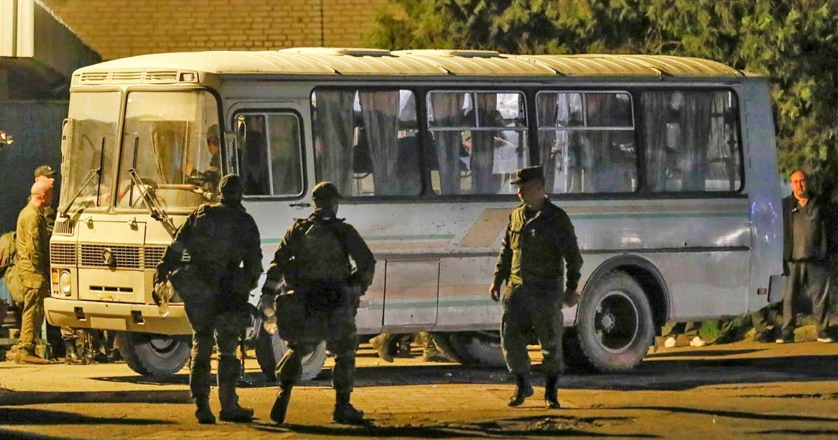 IMAGE: A bus carrying Ukrainian fighters, who have been trapped in the besieged Azovstal steel mill in Mariupol for 12 weeks fighting the Russian army, arrived under escort of pro-Russian troops in Novoazovsk. All photographs: Alexander Ermochenko/Reuters