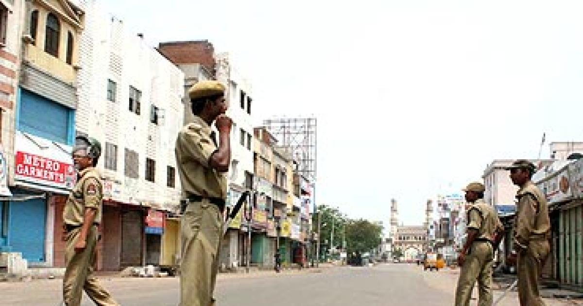 Image: Police enforce the curfew in the old city area of Hyderabad on Tuesday.