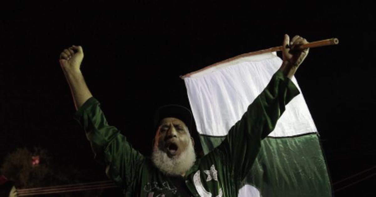 Image: A supporter of Imran Khan, cricketer-turned-opposition politician and chairman of the Pakistan Tehreek-e-Insaf, gestures holding a national flag while chanting slogans. Photograph: Faisal Mahmood/Reuters