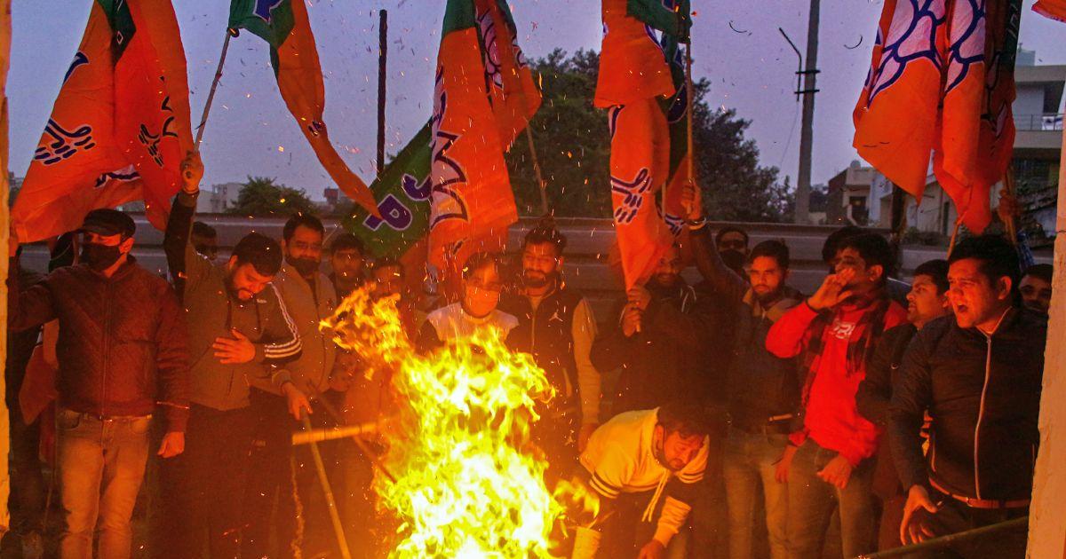 IMAGE: Youth BJP workers burn an effigy during their protest outside the Congress office over security breach in Prime Minister Narendra Modi's convoy in Punjab, in Gurugram. Photograph: PTI Photo