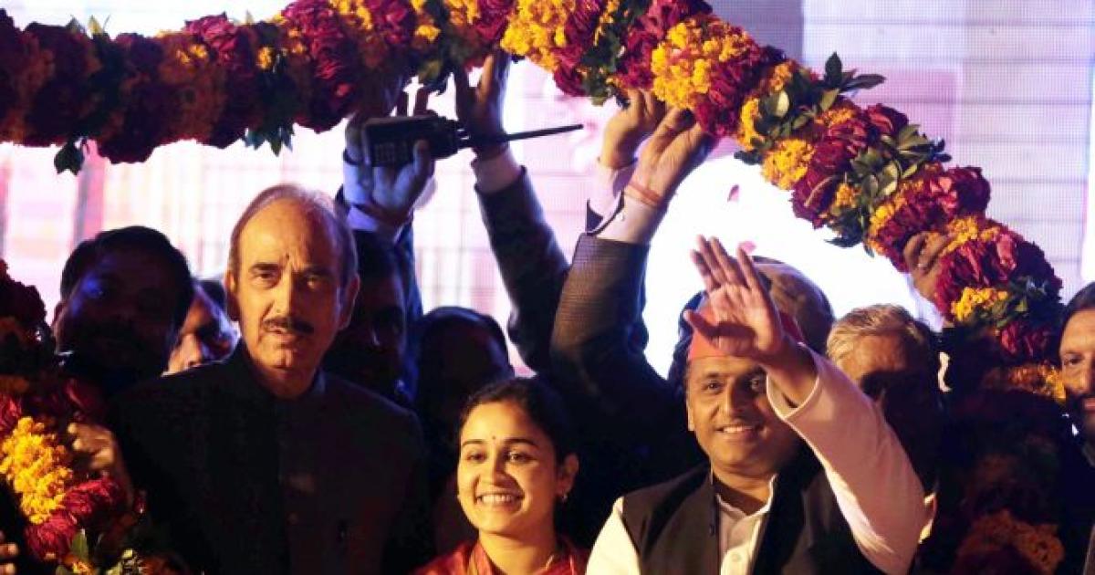 IMAGE: From right, Uttar Pradesh Chief Minister Akhilesh Yadav, SP candidate Aparna Yadav, and UP Congress in-charge Ghulam Nabi Azad at an election rally in Lucknow. Photograph: PTI Photo