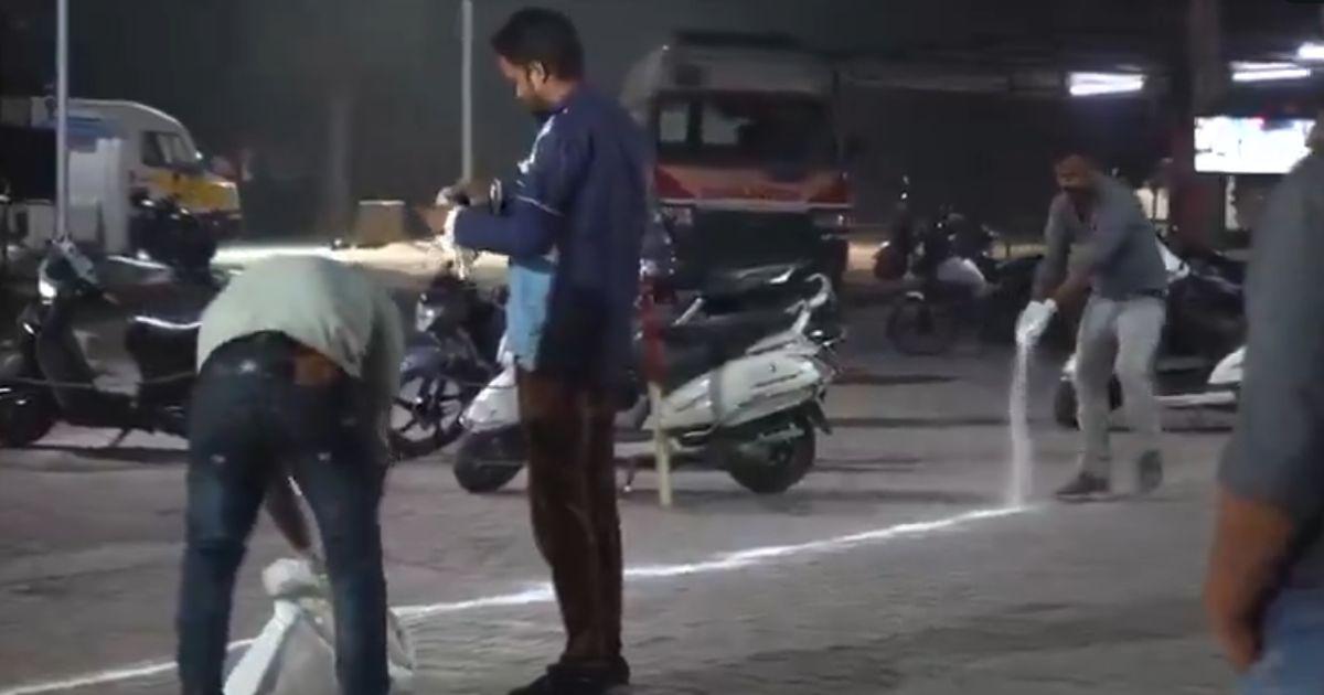 In a video doing the rounds on social media, some workers are seen making marks on the road with lime powder.