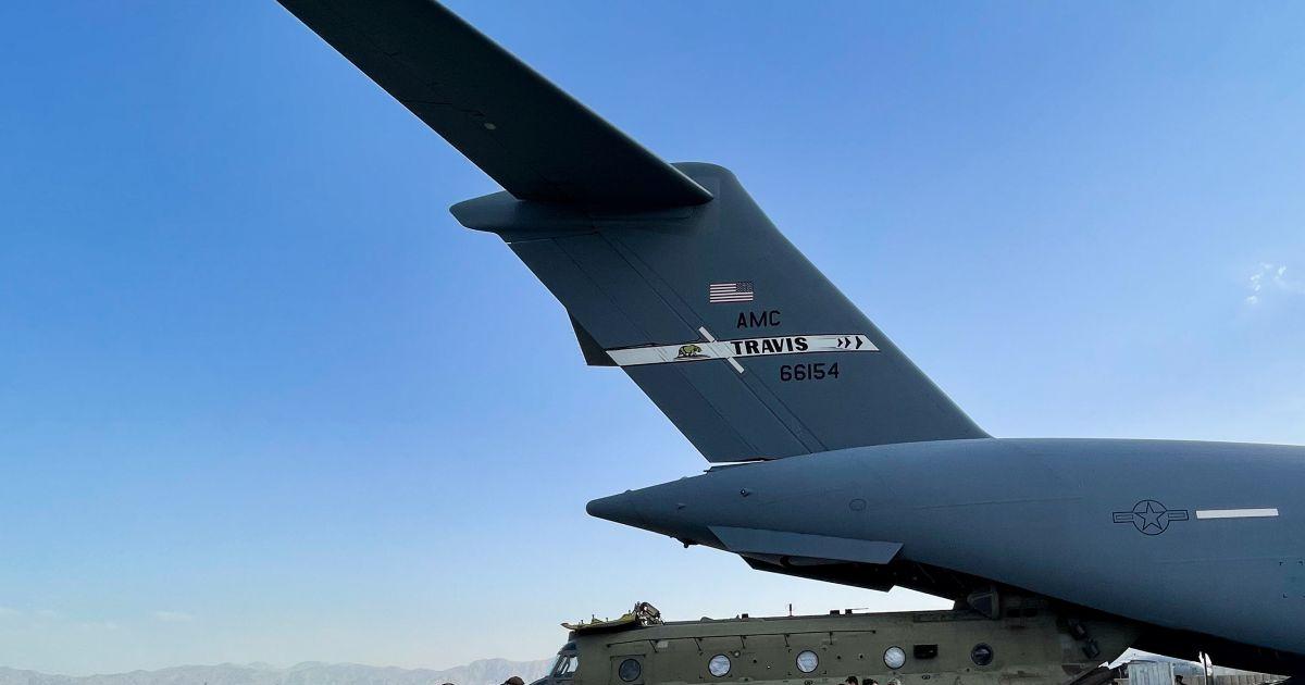 IMAGE: A CH-47 Chinook is loaded onto a US Air Force C-17 Globemaster III at Hamid Karzai International Airport in Kabul, Afghanistan. The Chinook is one of the pieces of equipment returning to the US as the military mission in Afghanistan comes to an end. Photograph: US Central Command/Handout via Reuters