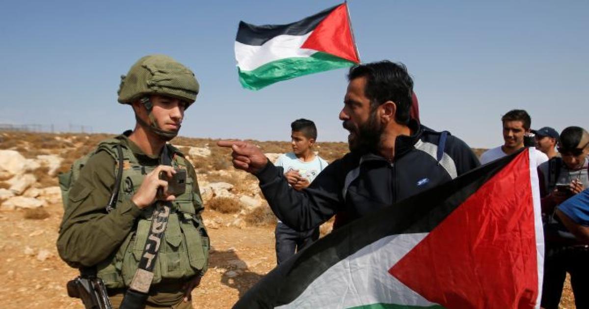 IMAGE: A Palestinian demonstrator argues with an Israeli soldier during a protest against Jewish settlements in al-Shuyukh village near Hebron, West Bank. Photograph: Mussa Qawasma/Reuters