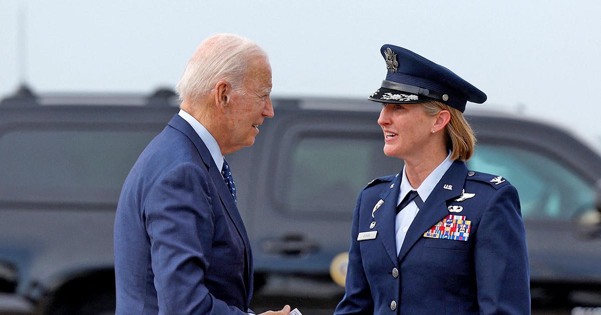 IMAGE: President Biden is greeted by Colonel Angela F Ochoa, Commander, 89th Airlift Wing, Andrews Air Force Base, 'who is responsible for worldwide special air mission airlift, logistics, aerial port and communications support for the President' of the United States. All Photographs: Evelyn Hockstein/Reuters