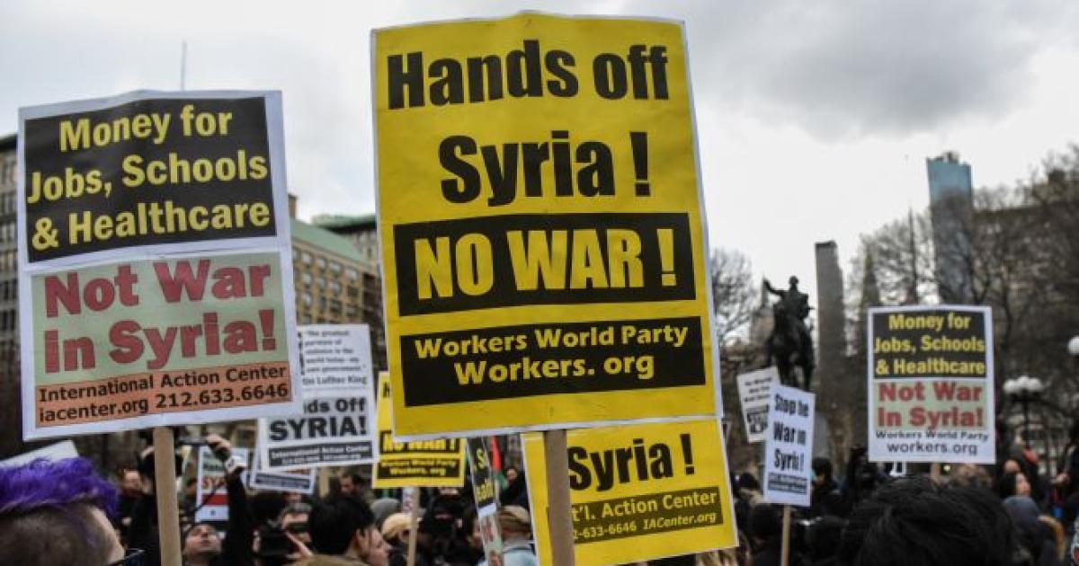 Image: People participate in a demonstration against the recent US strike in Syria, in New York. Photograph: Stephanie Keith/Reuters