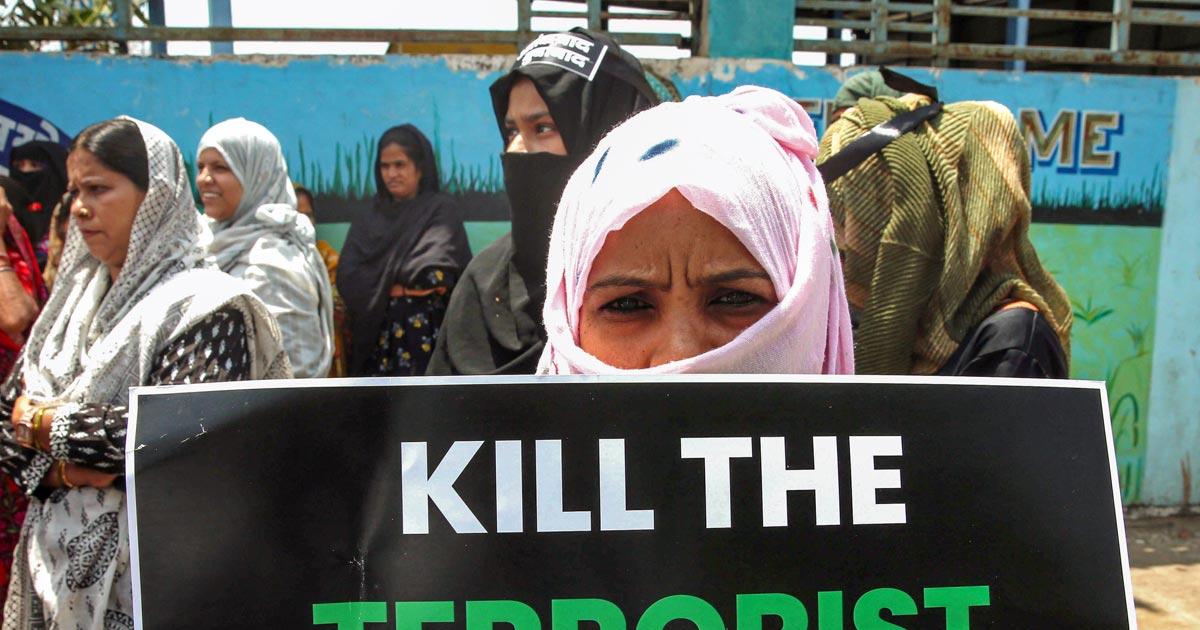 IMAGE: A woman holds a placard during a protest against the Pahalgam terror attack, in Bhopal. Photograph: ANI Photo