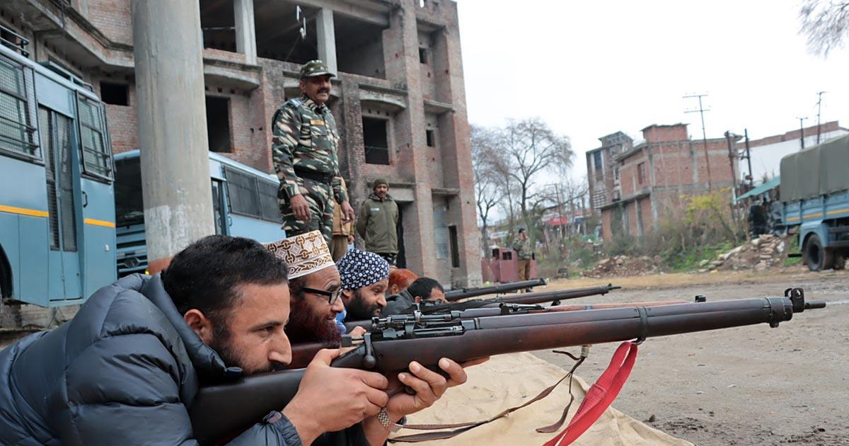 IMAGE: Central Reserve Police Force personnel provide arms training to Village Defence Committee members near the Line of Control in the Mendhar area of Poonch. Photograph: ANI Photo