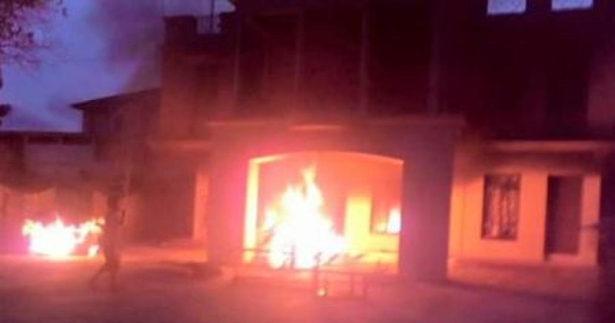 Image: The house of Minister in charge of Family Welfare Phungzaphang Tonsimg up in flames. Photograph: ANI/Twitter